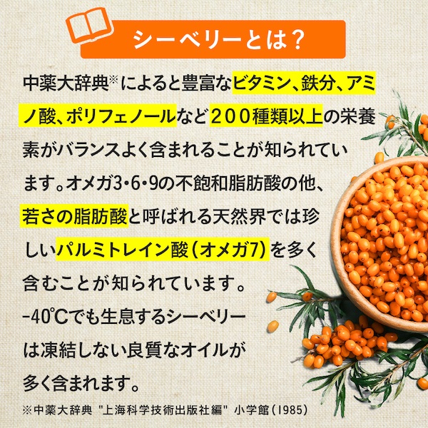 シーベリーには、ビタミンA・C・EやビタミンB群、カロテノイドやフラボノイド、ポリフェノール、有機酸、アミノ酸、鉄分などのミネラルが豊富に含まれています。