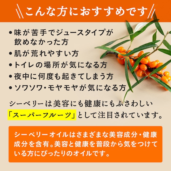欧米では「果実の王」とも呼ばれるシーベリーのオイルをたっぷり含んだサプリメント。シーベリーに含まれている栄養素は200種類以上にのぼると言われ、美容と健康に役立つ果実として近年注目されています。